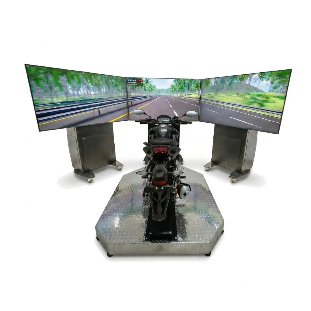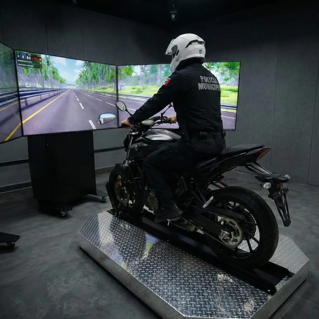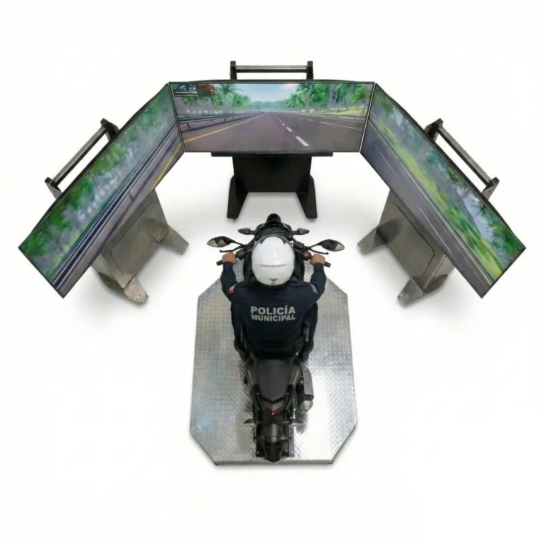 Equipo con plataforma de movimiento electromecánica de dos grados, tres pantallas 4K, 150 grados de visión, controles realistas y tres modelos de motocicletas evaluables.