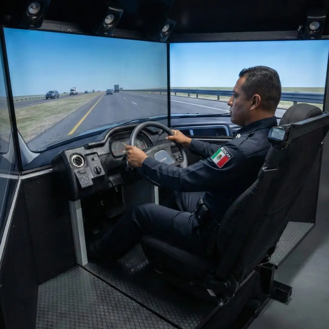 Sistema CGI autónomo diseñado para policías. Posee cabina real, tres pantallas HD de 55 pulgadas, 225 grados de visión, controles activos, sirenas y vibración.
